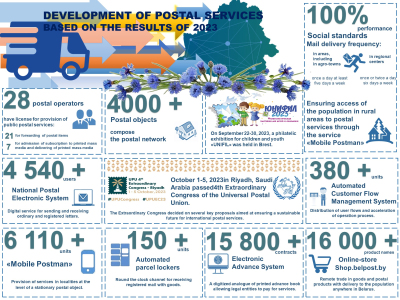 У Рэспубліцы Беларусь ліцэнзію на аказанне паслуг паштовай сувязі агульнага карыстання па перасылцы паштовых адпраўленняў, прыёме падпіскі на друкаваныя сродкі масавай інфармацыі і іх дастаўцы маюць 28 аператараў паштовай сувязі, з іх 21 – на паслугі па перасылцы паштовых адпраўленняў,7 – на прыём падпіскі на друкаваныя сродкі масавай інфармацыі і іх дастаўкі. Сярод новаўвядзенняў і дасягненняў у сферы паслуг паштовай сувязі, рэалізаваных за апошні час на базе IT-тэхналогій, якія спрыяюць павышэнню якасці забеспячэння жыццядзейнасці насельніцтва стала развіццё нацыянальнай паштовай электроннай сістэмы, пашырэнне сеткі паштаматаў, укараненне сервісу «Мабільны паштальён» і электроннай авансавай сістэмы для юрыдычных асоб. Нацыянальная паштовая электронная сістэма – гэта зручны і хуткі спосаб перасылкі простых і заказных лістоў у электроннай і гібрыднай форме з пацвярджэннем факта ўручэння. Колькасць зарэгістраваных карыстальнікаў у сістэме складае больш за 4 540 карыстальнікаў. Электронная авансавая сістэма разліку для юрыдычных асоб – гэта аблічбаваны аналаг папяровай авансавай кніжкі, які дазваляе ажыццяўляцьon-line залічэнне і спісанне грашовых сродкаў за паслугі паштовай сувязі, а таксама аплачваць шырокі спектр паслуг паштовай сувязі. Колькасць заключаных дагавораў на аказанне паслуг з выкарыстаннем электроннай авансавай сістэмы складае больш за 15 800 штук. Сервіс «Мабільны паштальён» дазволіў аўтаматызаваць работу паштальёнаў/паштовых кур'ераў і забяспечыць населеныя пункты, у тым ліку ў сельскай мясцовасці, сучаснымі паслугамі на аснове інфармацыйна-камунікацыйных тэхналогій. У цяперашні час у Рэспубліцы Беларусь функцыянуе больш за 6 110 адзінак. Для развіцця дадатковага кругласутачнага канала атрымання паштовых паслуг, павышэння ўзроўню абслугоўвання кліентаў і скарачэння часу чакання пры атрыманні паштовых адпраўленняў, якія рэгіструюцца, працягваецца пашырэнне сеткі і функцыянальных магчымасцей паштаматаў. Сетка паштаматаў Рэспублікі Беларусь у цяперашні час складае больш за 150 адзінак. Аўтаматызаваная сістэма кіравання патокамі кліентаў дазваляе размяркаваць патокі карыстальнікаў паслуг паштовай сувязі і паскорыць працэс іх абслугоўвання ў аб'ектах паштовай сувязі. У цяперашні час прызначаная сістэма функцыянуе ў больш як 380 аб'ектах паштовай сувязі. У Рэспубліцы Беларусь у поўным аб'ёме выконваюцца дзяржаўныя сацыяльныя стандарты па частаце дастаўкі пошты і забеспячэнню доступу насельніцтва ў сельскай мясцовасці да паслуг паштовай сувязі, якія аказваюцца нацыянальным аператарам паштовай сувязі з дапамогай сервісу «Мабільны паштальён». Працягваецца развіццё паштовай інтэрнэт-крамы Shop.belpost.by, галоўнай задачай якога з’яўляецца дыстанцыйны гандаль таварамі і паштовай прадукцыяй з дастаўкай насельніцтву ў любую кропку Беларусі, а таксама ў больш як 40 краін замежжа. На афіцыйным сайце нацыянальнага аператара паштовай сувязі прадстаўлена прадукцыя больш як300 вытворцаў/пастаўшчыкоў і размешчана больш за 16 000 найменняў тавараў. У перыяд c 1 па 5 кастрычніка 2023 г. ў г. Эр-рыяд, Саудаўская Аравія, прайшоў IV Надзвычайны Кангрэс Сусветнага паштовага саюза (СПС). Надзвычайны кангрэс прыняў рашэнне па некалькіх ключавых прапановах, накіраваных на забеспячэнне трывалай будучыні міжнародных паш