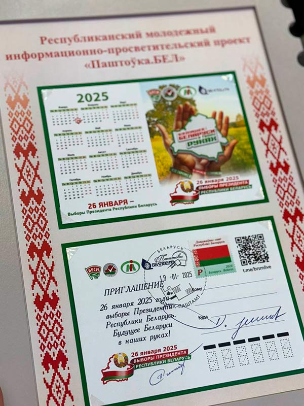 Сегодня, 19 января, на площадке БРСМ в Международном выставочном центре состоялась церемония старта молодежного информационного проекта «Паштоука. БЕЛ». Организаторами инициативы выступают Белорусский республиканский союз молодежи, Центральная избирательная комиссия, Министерство информации и Министерство связи и информатизации через Республиканское унитарное предприятие почтовой связи «Белпочта». Проект призван напомнить гражданам Беларуси об их конституционном избирательном праве, гражданской ответственности и периоде проведения выборов Президента Республики Беларусь. С 19 по 24 января во всех регионах страны на мероприятиях БРСМ, каждый желающий сможет заполнить открытку, а затем бесплатно направить ее своему адресату на территории Беларуси. Первые карточки посетители Международного выставочного центра уже могут отправить сегодня. Справочно: В феврале 2024 года накануне Единого дня голосования БРСМ выступил с инициативой проведения молодежного информационного проекта «Паштоука. БЕЛ», которую поддержали все организаторы. Наблюдался положительный эффект в части повышения электоральной активности граждан. В этой связи было принято решение продолжить реализацию проекта накануне последующих электоральных кампаний. Источник: @t.me/aslukyanau Малюнак Малюнак Малюнак PDF