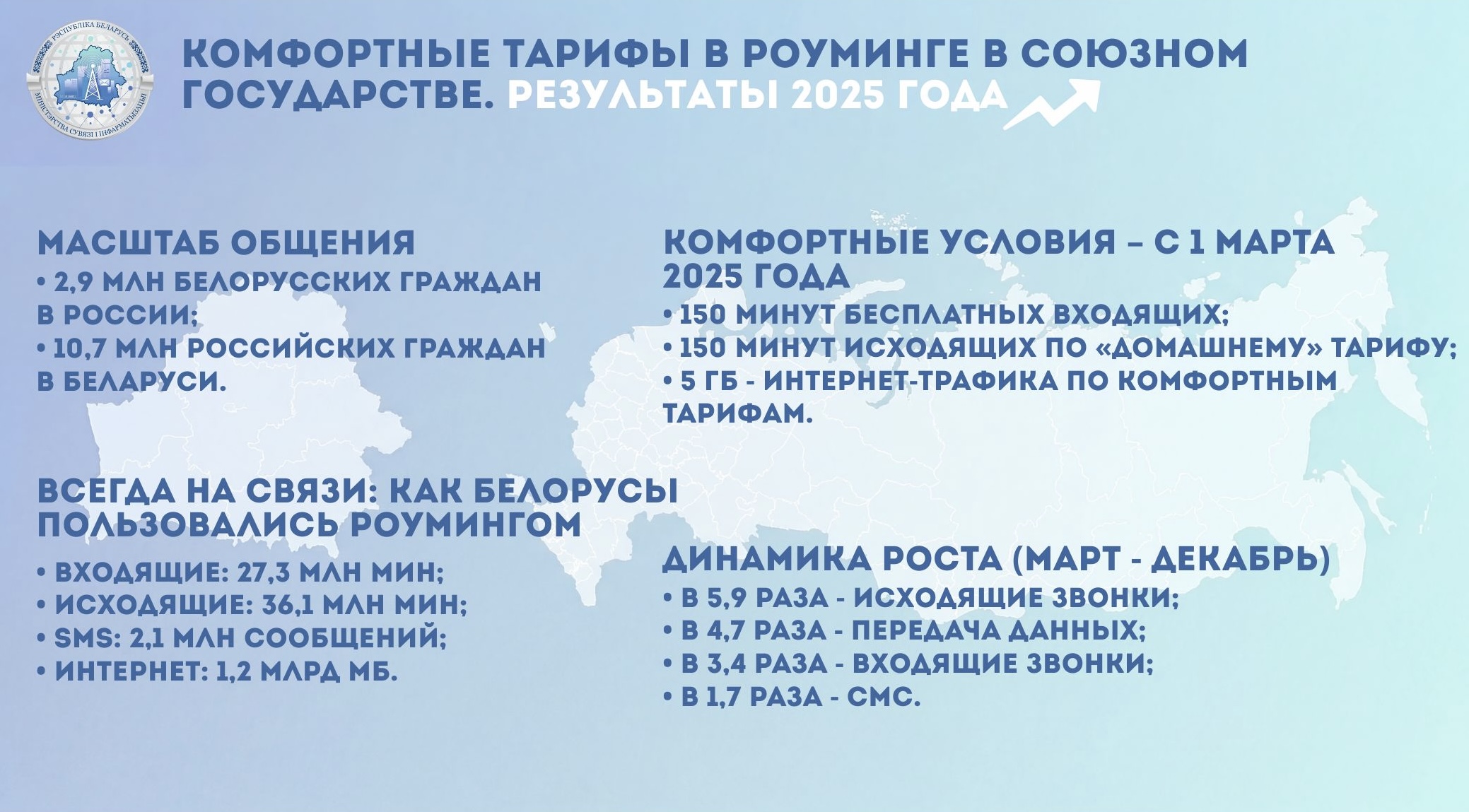 В 2025 году абоненты активно пользовались услугами роуминга на территории Союзного государства, из них:2,9 млн. белорусских граждан в России;10,7 млн. российских граждан в Беларуси.С 1 марта 2025 г. операторы связи ввели Беларуси и России новые, комфортные условия пользования роумингом для абонентов:150 минут бесплатных входящих голосовых вызовов;150 минут исходящих голосовых вызовов в рамках «домашнего» тарифа;до 5 Гб Интернета по комфортным тарифам, сопоставимым с тарифами в «домашней» сети.В 2025 году белорусские граждане, находящиеся на территории Российской Федерации, активно пользовались услугами роуминга:принято 27,3 млн. минут входящих вызовов;совершено 36,1 млн.минут исходящих звонком, из них более 75 процентов (28 млн.минут) тарифицировано в рамках «домашнего» тарифного плана;отправлено 2,1 млн. СМС;потребление интернета составило 1,2 млрд. МБ.В результате, за март-декабрь 2025 года (к соответствующему периоду 2024 года) зафиксирован рост потребления абонентами трафика:в 3,4 раза – по входящим звонкам;в 5,9 раза – по исходящим звонкам;в 1,7 раза – СМС;в 4,7 раза – передача данных. Малюнак PDF