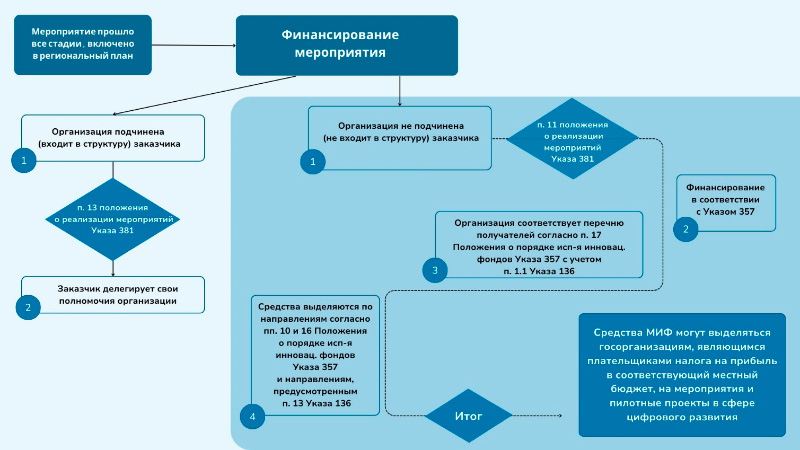 Фінансаванне мерапрыемстваў у сферы лічбавага развіцця, рэалізацыя якіх ажыццяўляецца за кошт сродкаў мясцовых інавацыйных фондаў, праводзіцца ў парадку, прадугледжаным Указам № 357.