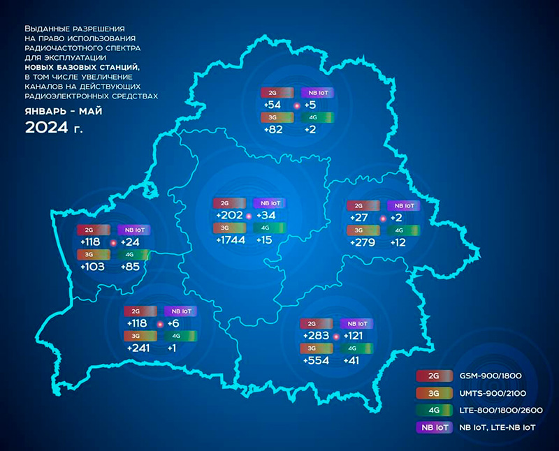З пачатку 2024 года спецыялістамі выдадзена 4153 дазволаў на права выкарыстання радыёчастотнага спектру пры эксплуатацыі базавых станцый у мэтах павелічэння радыёчастотных каналаў на дзеючых базавых станцыях тэхналогій GSM (2G) у дыяпазонах 900/1800 МГц, UMTS (3G) у дыяпазонах 900/2100 МГц, LTE (4G) у дыяпазонах 800/1800/2600 МГц, NB IoT.