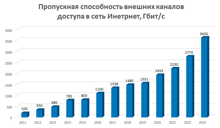 У цэлым з 2016 года сумарная ёмістасць павялічана больш як у тры разы. Гэта характэрная рыса развіцця ўсіх без выключэння сегментаў сеткі Інтэрнэт. Сёння паўсюдна назіраецца прыцягненне абанентаў менавіта да «цяжкага» мультымедыйнага кантэнту, што патрабуе развіцця адпаведнай інфраструктуры для задавальнення попыту насельніцтва на высокія хуткасці перадачы даных, а таксама патрабаванняў абанентаў да якасці паслуг перадачы даных.