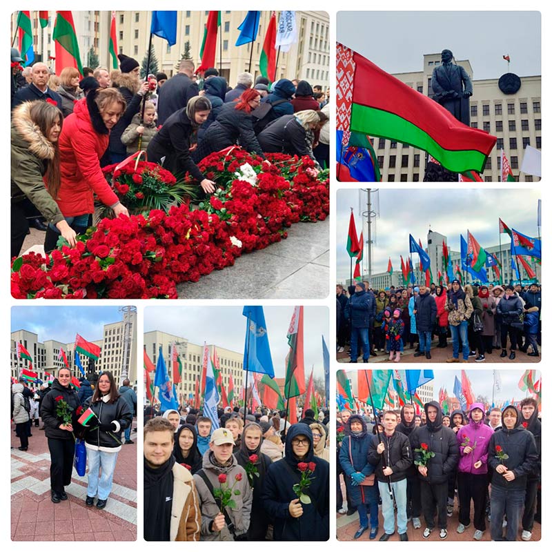 Торжественная церемония возложения цветов к памятнику В.И. Ленина состоялась на площади Независимости в Минске в рамках празднования 107-й годовщины Октябрьской революции. Работники предприятий связи и студенты Академии связи приняли участие в торжественной церемонии возложения цветов Изображение PDF