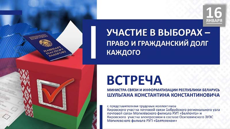 Министр связи и информатизации Константин Шульган в рамках единого дня информирования посетит Могилевскую область. Тема январского дня информирования: Участие в выборах – право и гражданский долг каждого. Глава Минсвязи встретится с представителями Кировского участка почтовой связи Бобруйского регионального узла почтовой связи Могилёвского филиала РУП «Белпочта» и Кировского участка электросвязи в составе Осиповичского ЗУЭС Могилевского филиала РУП «Белтелеком» Изображение PDF