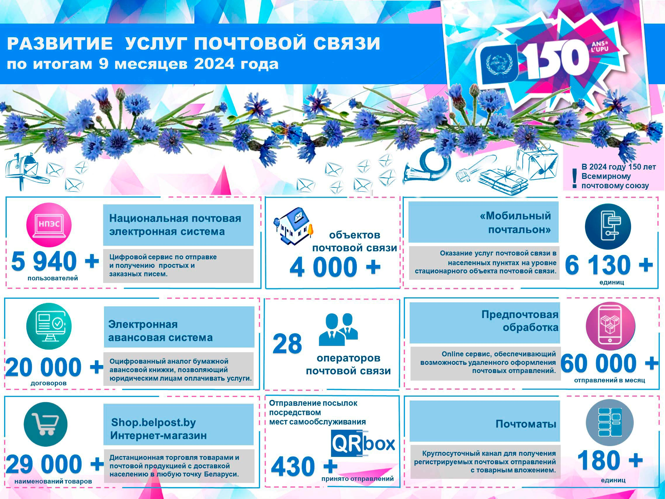 На сегодняшний день в Республике Беларусь сеть почтовой связи насчитывает более 4 тысяч объектов почтовой связи. Лицензию на оказание услуг почтовой связи общего пользования по пересылке почтовых отправлений, приему подписки на печатные средства массовой информации и их доставке имеют 28 операторов почтовой связи. К новшествам и достижениям в сфере услуг почтовой связи, реализованным за последнее время на базе IT-технологий, относятся развитие национальной почтовой электронной системы, электронной авансовой системы, сервисов «Мобильный почтальон», предпочтовой обработки, мест самообслуживания QR box, а также расширение сети почтоматов. Национальная почтовая электронная система – это удобный и быстрый способ пересылки простых и заказных писем в электронной и гибридной форме с подтверждением факта вручения. Количество зарегистрированных пользователей в системе составляет более 5 940 пользователей. Электронная авансовая система расчета для юридических лиц – это оцифрованный аналог бумажной авансовой книжки, позволяющий осуществлять online зачисление и списание денежных средств за услуги почтовой связи, а также оплачивать широкий спектр услуг почтовой связи. Количество заключенных договоров на оказание услуг с использованием системы составляет более 20 000 штук. Сервис «Мобильный почтальон» позволил обеспечить населенные пункты, в том числе в сельской местности, широким спектром услуг вне объекта почтовой связи, в том числе услуги почтовой связи, банковские, финансовые и другие услуги. В настоящее время в Республике Беларусь функционирует более 6 130 единиц. Для развития дополнительного круглосуточного канала получения услуг почтовой связи, повышения уровня обслуживания пользователей и сокращения их времени ожидания при получении почтовых отправлений продолжается расширение сети и функциональных возможностей почтоматов. Сеть почтоматов Республики Беларусь в настоящее время составляет более 180 единиц. Предпочтовая обработка – online сервис, обеспечивающий возможность удаленного оформления почтовых отправлений, печать необходимой сопроводительной документации, ускоренное оформление почтового отправления по штрих-коду в объекте почтовой связи или почтомате. Ежемесячно посредством этого сервиса отправляется порядка 60 тыс. отправлений. В целях развития цифровых сервисов c июля 2024 года внедрен сервис по оформлению и оплате в личном кабинете почтового отправления для отправки в местах самообслуживания QR box. Отправка осуществляется путем сканирования QR-кода в мобильном приложении. С момента внедрения сервиса принято более 440 отправлений. Продолжается развитие Почтового интернет-магазина Shop.belpost.by, главной задачей которого является дистанционная торговля товарами и почтовой продукцией с доставкой населению в любую точку Беларуси, а также в более 49 стран зарубежья. На официальном сайте национального оператора почтовой связи представлена продукция более 325 производителей/поставщиков и размещено более 29 000 наименований товаров. Изображение PDF