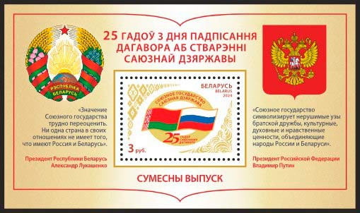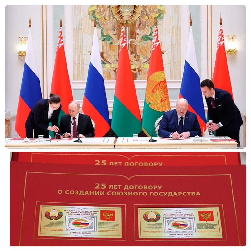Церемония специального гашения почтовых блоков к 25-летию со дня подписания Договора о Союзном государстве (8 декабря 1999 года) состоялась в Минске во Дворце Независимости, передает корреспондент БЕЛТА. Церемонию провели после заседания Высшего государственного совета Союзного государства. В ней приняли участие президенты Александр Лукашенко и Владимир Путин. На торжественном мероприятии присутствовали высшие должностные лица обеих стран. Источник: Белта Фото: Белта, ПулПервого Картинка марки: Белпочта Изображение Изображение Изображение PDF