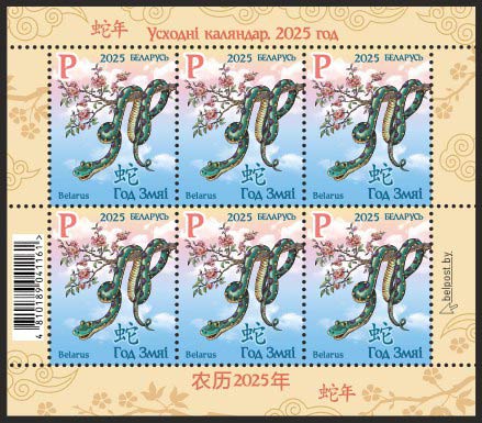 15 января 2025 года Министерство связи и информатизации Республики Беларусь выпускает в обращение почтовую марку «Год Змеи» из серии «Восточный календарь». Художник спецштемпеля и конверта «Первый день» В. Чайчук. Дизайн Е. Бедоник. Марка печаталась в РУП «Бобруйская укрупненная типография им. А.Т. Непогодина». В день выпуска почтовой марки в обращение на почтамте Минска будет проводиться специальное гашение на конверте «Первый день». Проект подготовлен в сотрудничестве с Республиканским институтом китаеведения имени Конфуция Белорусского государственного университета. Почтовая марка «Год Змеи» продолжает серию выпусков по тематике «Восточный календарь». Восточный (китайский) календарь основан на 12-летнем лунном цикле, в котором каждый год проходит под знаком одного животного. Новый год по восточному календарю приходится на разные даты между 21 января и 20 февраля. 2025-й – год Зеленой Деревянной Змеи, который наступит 29 января 2025 года и продлится до 16 февраля 2026 года. Изображение PDF