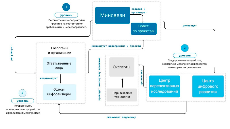Новая система управления цифровым развитием сформировалась в нашей стране после вступления в силу Указа Президента Республики Беларусь от 7 апреля 2022 г. № 136 (Указ № 136).В его развитие приняты ряд нормативных правовых актов, которые определили институты этой системы. Последние созданы для эффективной работы нового механизма реализации ИТ-проектов. Визуально сформированная вертикаль управления цифровым развитием система может быть представлены в виде трех основных уровней (см. рисунок ниже).Первый уровень – стратегический, отведен Министерству связи и информатизации (Минсвязи). Для принятия решений по вопросам цифрового развития при Минсвязи создан Совет по проектам в сфере цифрового развития (Совет) – межведомственный координационный орган. В его состав входят руководители (или их заместители) Администрации Президента Республики Беларусь, Минсвязи, Министерства экономики, Министерства финансов, Министерства юстиции, Министерства антимонопольного регулирования и торговли, Оперативно-аналитического центра при Президенте Республики Беларусь, Комитета государственного контроля.Совет решает вопросы о целесообразности реализации мероприятий перед проведением экспертизы, между тем принятие решения Советом о целесообразности реализации пилотных проектов осуществляется на основании результатов экспертизы. Он также рассматривает пилотные проекты, связанные с внедрением информационных систем и цифровых платформ в рамках государственно-частного партнерства, и принимает решения о необходимости и условиях их реализации. Кроме этого, Совет осуществляет согласование показателей цифрового развития отраслей экономики и административно-территориальных единиц.Организационно-техническое, научно-методическое и экспертное сопровождение процессов цифрового развития закреплено за Центром перспективных исследований (ЦПИ), который создан в структуре ОАО «Гипросвязь», а также за Центром цифрового развития (ЦЦР). Кроме этого, ЦПИ формирует предложения по проектам прогнозов цифрового развития, показателям уровня цифрового развития отраслей и регионов, собирает информацию для оценки эффективности реализации мероприятий. В свою очередь, ЦЦР обладает статусом головной организации по реализации мероприятий в сфере цифрового развития. Будучи головной организацией, ЦЦР выполняет функции по разработке и сопровождению государственных цифровых решений, участию в создании единой архитектуры государственных цифровых платформ и информационных систем, а также обеспечению координации деятельности государственных органов и организаций по вопросам разработки технических решений и мониторинга хода реализации мероприятий в сфере цифрового развития.В соответствии с Указом № 136 координацию цифрового развития на отраслевом и межотраслевом уровнях осуществляют лица, ответственные за вопросы цифрового развития (как правило, это заместители руководителей госорганов), практическую реализацию мероприятий и проектов обеспечивают «офисы цифровизации». «Офисы цифровизации» определены из числа юридических лиц, подчиненных (входящих в систему) государственным органам и иным государственным организациям, и (или) из числа структурных подразделений данных государственных органов и иных государственных организаций. Перечень «
