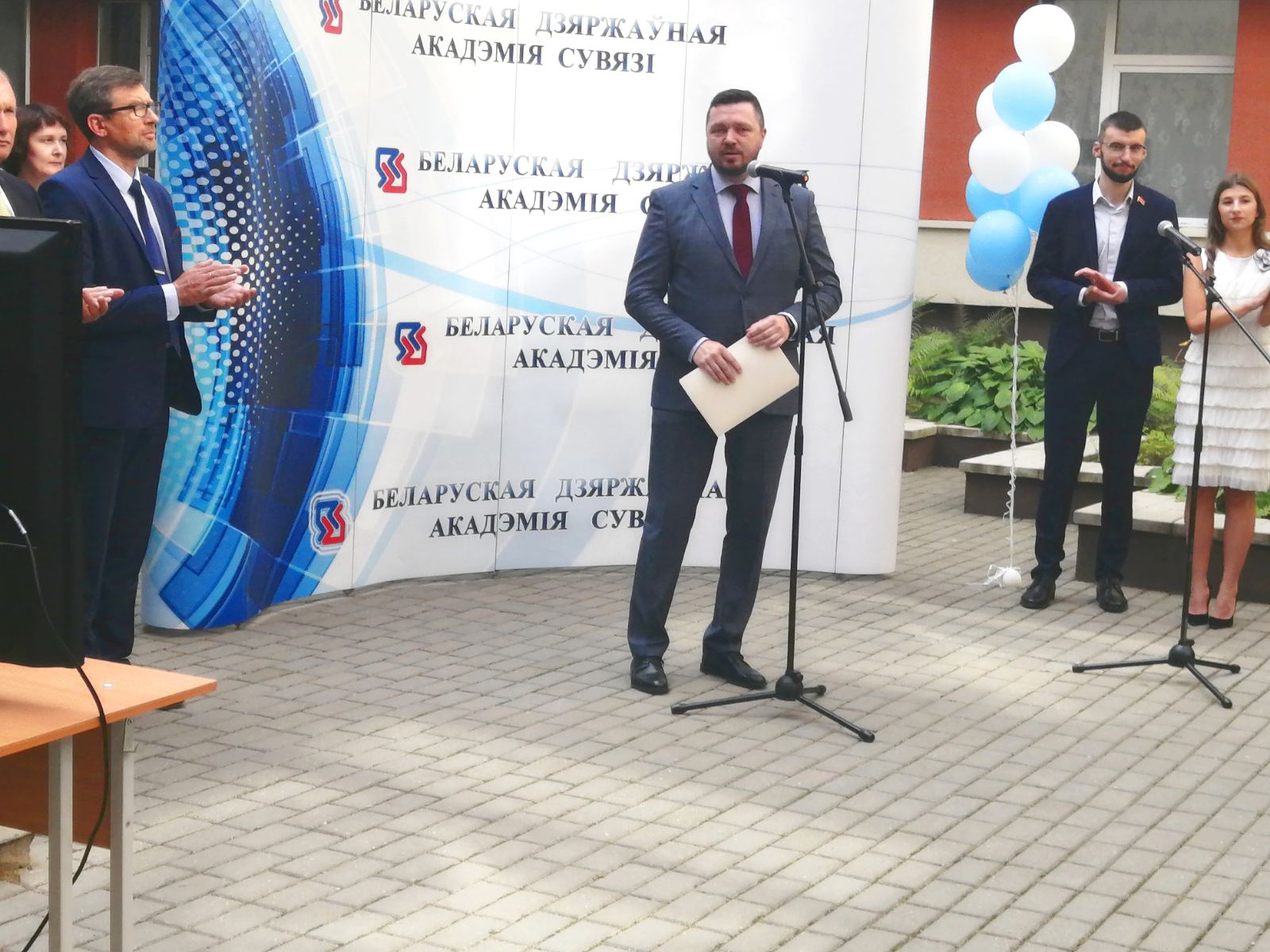 Прозвучали поздравления и в адрес профессорско-преподавательского коллектива Академии связи. Свои пожелания присутствующим высказал и председатель Белорусского профессионального союза работников связи Александр Яковлев. В ходе торжественной линейки был организован телемост между структурными подразделениями данного учебного заведения, его витебским филиалом и учебным корпусом №2.