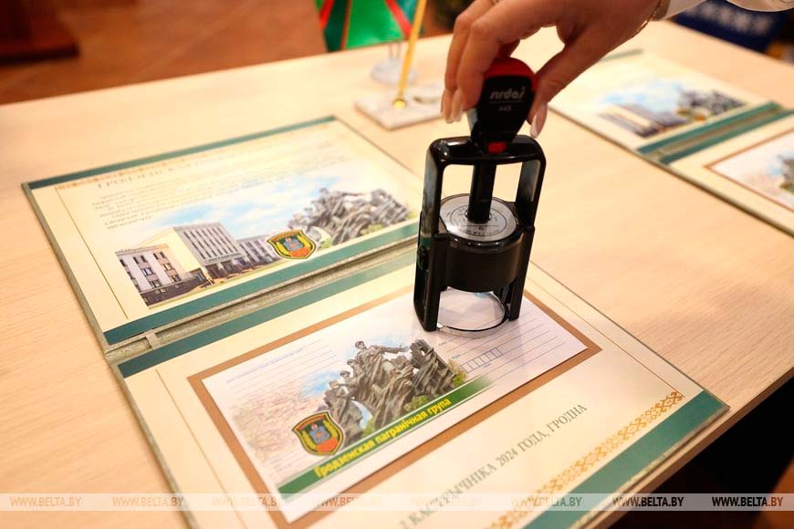 2 октября в Гродно состоялась презентация почтового проекта, посвященного одному из старейших и наиболее крупных соединений пограничной службы Беларуси – Гродненской пограничной группе, которая ведет отсчет своей истории с момента получения Боевого Знамени воинской части – 3 октября 1944 года. Художественный маркированный конверт, тираж которого составил 10 тысяч экземпляров, подготовлен Министерством связи и информатизации Республики Беларусь и РУП «Белпочта» в тесном взаимодействии с Государственным пограничным комитетом Республики Беларусь. В церемонии гашения приняли участие заместитель Председателя Государственного пограничного комитета генерал-майор Игорь Печень и генеральный директор РУП «Белпочта» Светлана Юркевич. - Позвольте выразить благодарность Пограничному комитету за многолетний и плодотворный совместный труд по созданию почтовых проектов, посвященных пограничникам Беларуси. И мы надеемся, что совместная работа по созданию почтовой продукции этой тематики будет продолжена. Позвольте пожелать вам успехов в нелегкой и ответственной деятельности, благополучия, мира и добра! – отметила Светлана Викторовна. Изображение PDF