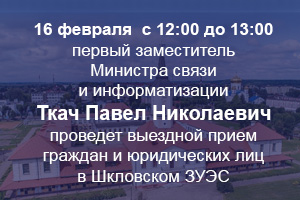 16 февраля 2024 года с 12:00 до 13:00 первый заместитель Министра связи и информатизации Республики Беларусь Ткач Павел Николаевич проведет выездной прием граждан и юридических лиц в Шкловском зональном узле электросвязи Могилевского филиала РУП «Белтелеком» с одновременным подключением «прямой телефонной линии». Жители города Шклова смогут задать вопросы, затрагивающие деятельность в области связи (как почтовой, так и электросвязи) и цифрового развития. 📍Место проведения приема: г. Шклов, Советская, 47, студия Шкловского ЗУЭС. Телефон для проведения «прямой телефонной линии» 8 (02239) 40000 Предварительная запись на прием будет осуществляться с 12 по 15 февраля с 9.00 до 13.00 и с 14.00 до 17.00 по телефону 8 (02239) 95530 PDF