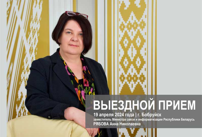 19 апреля 2024 года с 12.00 до 13.00 заместитель Министра связи и информатизации Республики Беларусь Рябова Анна Николаевна проведет выездной прием граждан и юридических лиц в Бобруйском региональном узле почтовой связи с одновременным подключением «прямой телефонной линии». Жители города Бобруйска и Бобруйского района смогут задать вопросы, затрагивающие деятельность в области связи (как почтовой, так и электросвязи) и цифрового развития. Место проведения приема: г. Бобруйск, ул. Минская, д. 21 , кабинет №94Телефон для прямой телефонной линии – +375 225 43 56 60. Предварительная запись на прием будет осуществляться с 15 по 18 апреля с 9.00 до 12.30 и с 13.00 до 17.00 по телефону +375 225 43 56 44. Изображение PDF