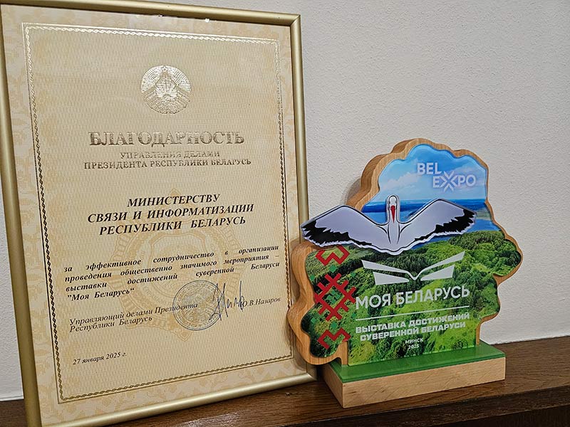 Сегодня, 27 января, состоялось торжественное закрытие выставки достижений суверенной Беларуси «Моя Беларусь», которая целый месяц радовала посетителей на площадке нового Минского Международного выставочного центра. Стенд «Умный город» удивил IT-разработками и возможностями инновационных технологий. За эффективное сотрудничество в организации проведения общественно значимого мероприятия – выставки достижений суверенной Беларуси «Моя Беларусь» благодарностью Управления делами Президента Республики Беларусь отмечено Министерство связи и информатизации Республики Беларусь. В торжественном мероприятии приняла участие заместитель министра связи и информатизации Татьяна Рускевич. За месяц работы выставку посетило более 400 000 человек, в том числе более 150 тысяч детей. Более 11000 пожеланий и отзывов о выставке оставили посетители на локации «Всем сердцем с Беларусью». 12000 детей приняли участие в квесте по выставке и получили подарки от организаторов. В рамках выставки состоялось 69 культурно-развлекательных мероприятий, 25 деловых событий, на сцене выступили 74 коллектива. Выставка наглядно продемонстрировала, что мы можем все, если мы вместе, потому что Беларусь – это место силы. Изображение Изображение PDF