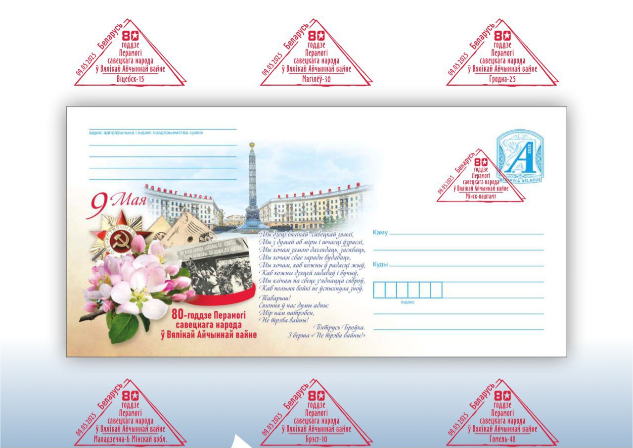Министерство связи и информатизации Республики Беларусь выпускает в обращение памятные спецштемпеля, которые будут использоваться 9 мая 2025 года для проведения специального гашения, посвященного 80-летию Победы советского народа в Великой Отечественной войне. К этому событию РУП «Белпочта» подготовило художественный маркированный конверт с литерной маркой «А». Дизайн Е. Медведь. Тираж 7 тыс. Цвет мастики – красный. Места гашения: Минск-почтамт, отделение почтовой связи № 10 Бреста, отделение почтовой связи № 15 Витебска, отделение почтовой связи № 48 Гомеля, отделение почтовой связи № 25 Гродно, отделение почтовой связи № 30 Могилева, отделение почтовой связи № 6 Молодечно Минской обл. Проект подготовлен по материалам из фондов Белорусского государственного музея истории Великой Отечественной войны и частной коллекции С.В. Пилиповича. Малюнак PDF