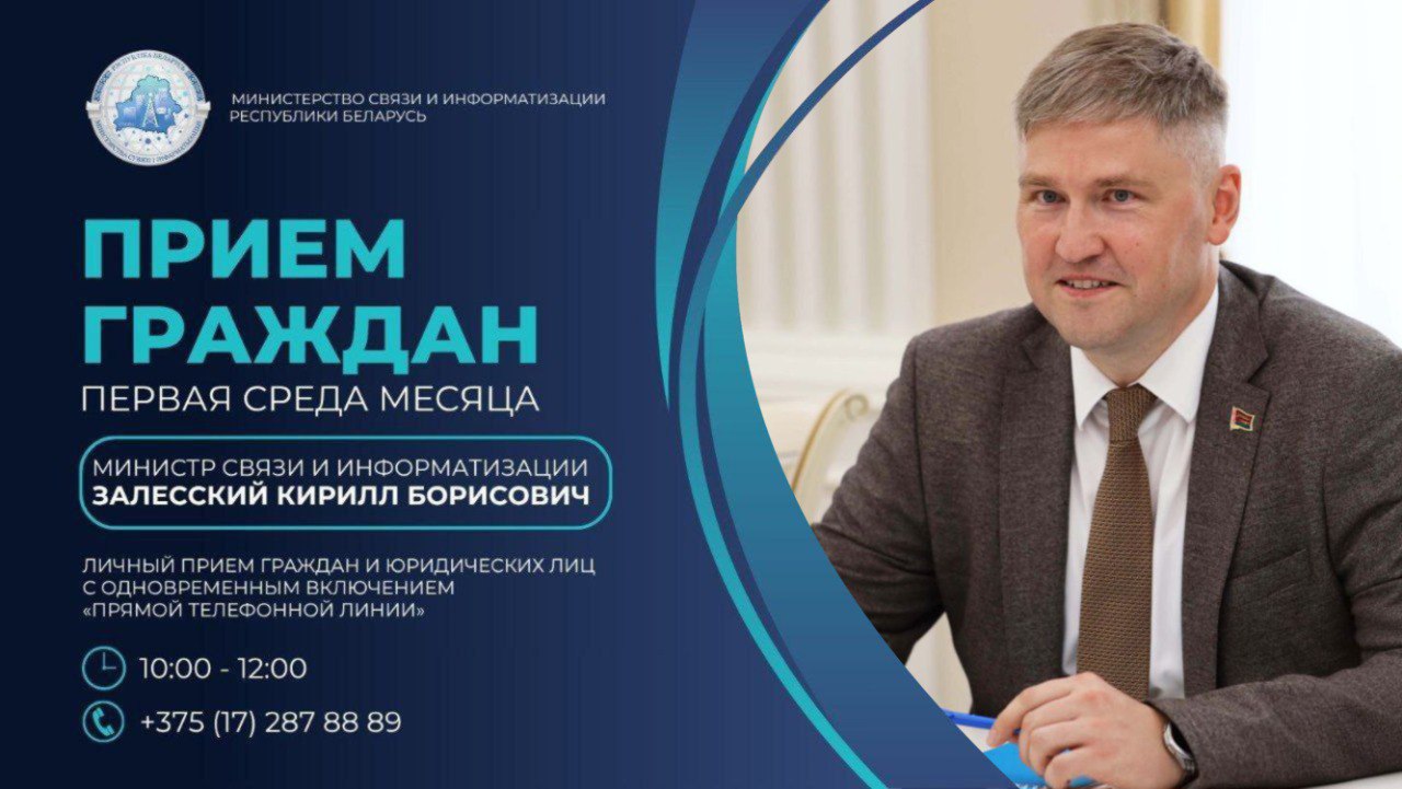 3 декабря 2025 года с 8.00 до 13.00 Министр связи и информатизации Залесский Кирилл Борисович проведет личный прием в министерстве. Прием граждан и юридических лиц проводится по адресу г.Минск, пр-т Независимости, 10, первый этаж – комната приема граждан, вход со стороны ул. Володарского. С 10.00 до 12.00 будет включена «прямая телефонная линия» по телефону +375 (17) 287 88 89. На личный прием можно записаться предварительно по телефону +375 (17) 287 87 06 (10) или с помощью электронной почты mpt@mpt.gov.by (в электронном письме обязательно необходимо указать: фамилию, имя, отчество заявителя, контактный телефон, адрес проживания и краткое содержание возникшего вопроса). Обращаем Ваше внимание, что в соответствии с законодательством при обращении на «прямую телефонную линию» необходимо указывать Ф.И.О. и данные о месте жительства и/или работы/учебы. Изображение PDF